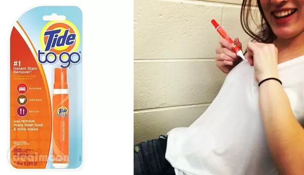 建议:Tide To Go Instant Stain Remover Liquid汰渍便携去污笔,记号笔一样的大小,可以放在包里随身携带出门。轻松去除顽固的污渍例如食物残渣,咖啡酒渍,各种酱料,水果果汁等等。