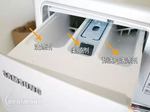 建议:洗衣剂(detergent),柔顺剂(softener)用来增加面料弹性,除静电。漂白剂(bleach)用于白色衣服的消毒除菌,有些漂白剂也可用于彩色衣服上。洗衣机有专门的槽用来放各种洗涤产品,如下图。