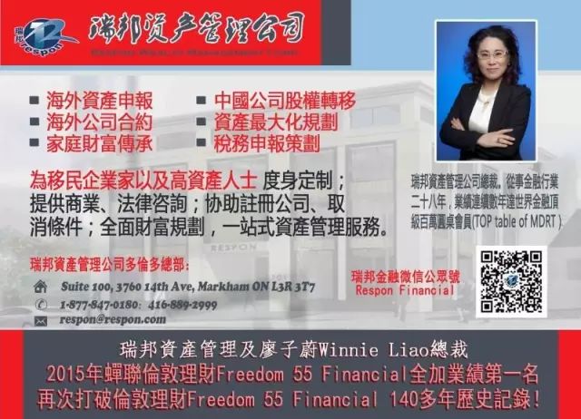 主 讲 人:廖子蔚 Winnie, Hong Wei, Liao (瑞邦资产管理公司总裁) 讲座时间:2016年9月17日(星期六) 10:30am-2:30pm(提供免费午餐) 讲座地点:Suite 218, 50 Westmount Road North, Waterloo ON, N2L 2R5 订座电话:519-781-7518, 519-208-6668, 1-877-847-0180 报名邮箱:cindyrespon@gmail.com 微信报名:cindywaterloo