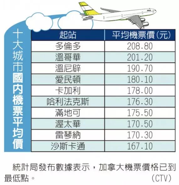 据了解,近年来机票价格不断调降,至去年上年达到最低点。以国内线而言,平均每张机票价格降至184.90元,较2013年减少3.1%。而加国主要10个城市的票价也全面下调,沙斯卡通起飞的票价降幅7.4%最大,平均价格仅167.10元;爱民顿降幅最小,只下调1%。由于多伦多皮尔逊机场(Pearson Airport)长途航班频繁,因此多伦多的平均票价达208.80元居全国之冠。温哥华及温尼辟则维持在全国平均水准。